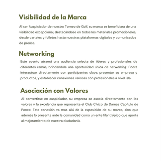 El Club Cívico de Damas de Puerto Rico capítulo de Ponce es una organización sin fines de lucro, establecida con el fin de hacer obras de beneficencia y ayudar al prójimo. En esta ocasión nos place invitarlos a colaborar en nuestro Primer Torneo de Golf, el cual se llevará a cabo el 15 de noviembre de 2024 en Costa Caribe Golf & Country Club en Ponce, Puerto Rico. Contamos, ademas, con el Boxeador Puertorriqueño Miguel Cotto como Padrino de este magno evento.